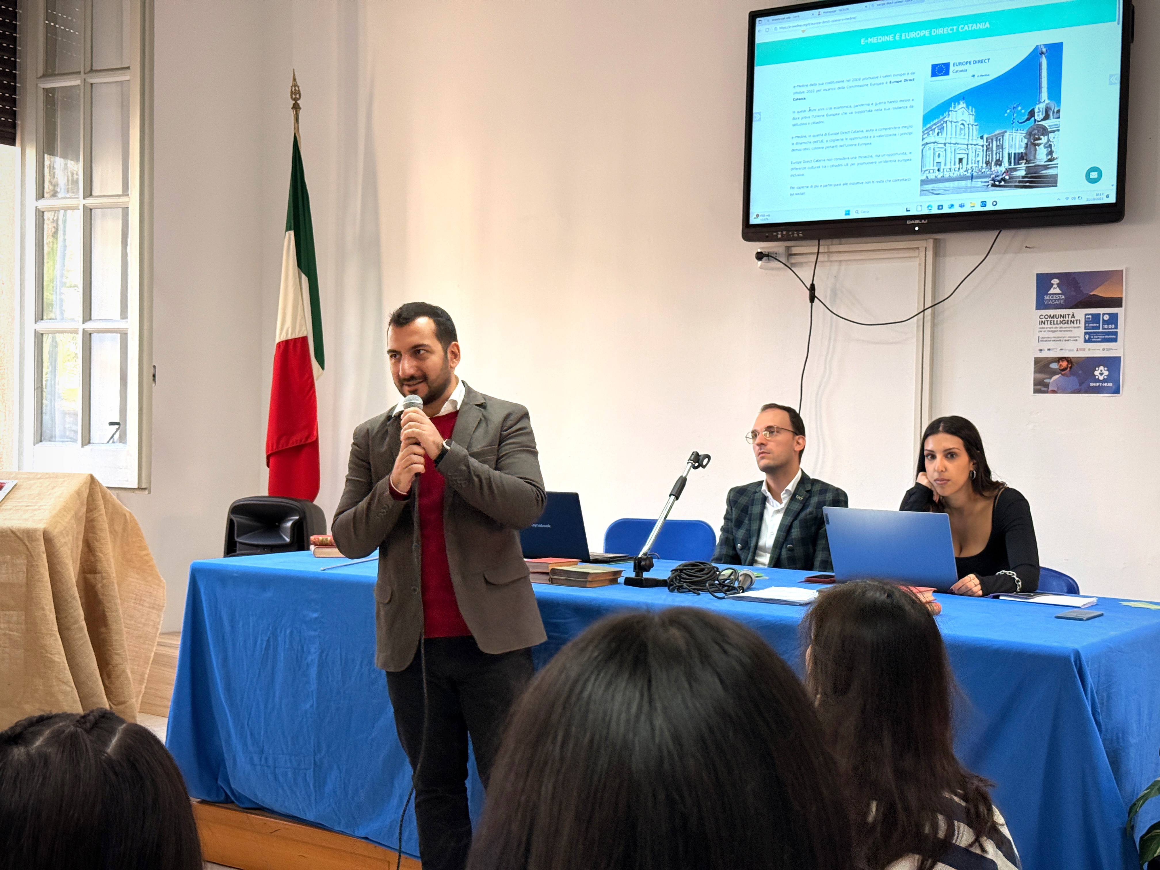 L’iniziativa, promossa dal centro Europe Direct Catania, col patrocinio di JO Education, si è svolta nell’aula magna dell’Istituto Superiore “G. De Felice Giuffrida – Olivetti”, dove si sono riunite due classi quarte.